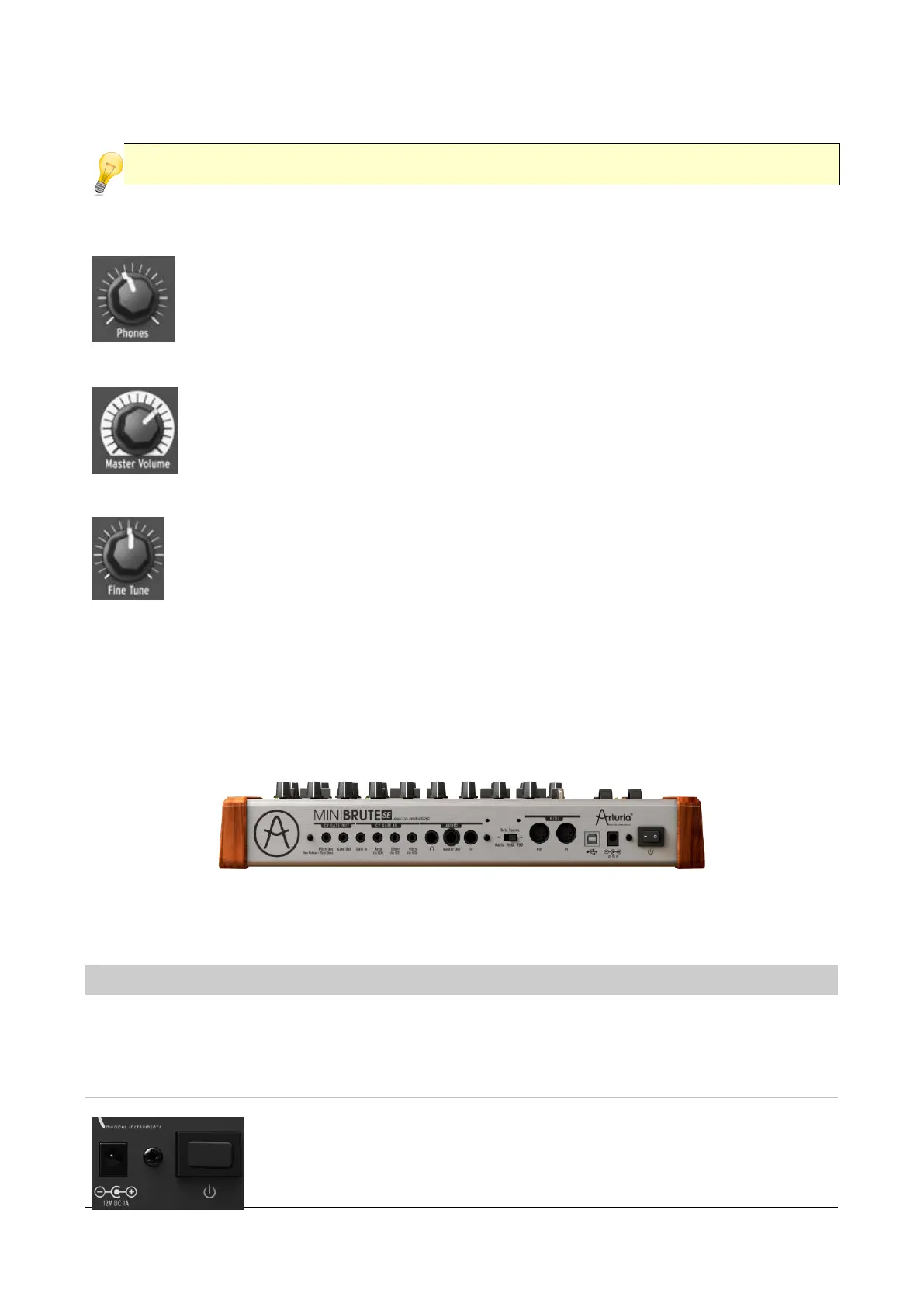 fits the standard +4dBu line level. To silence the MiniBrute, turn this knob