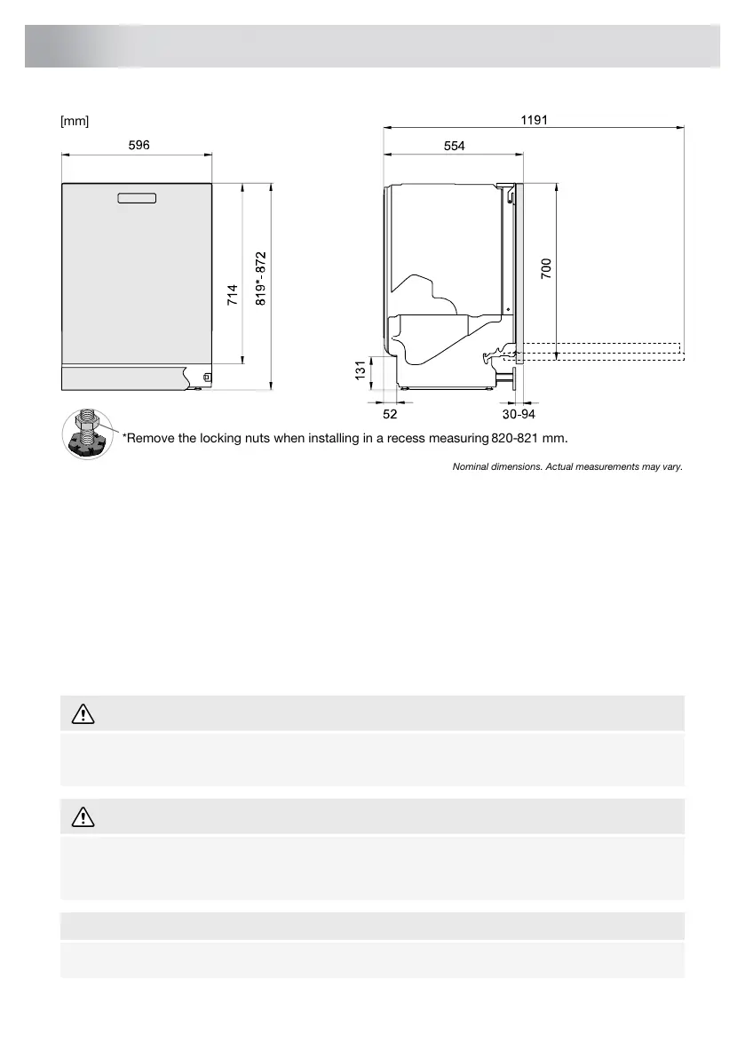 *Remove the locking nuts when installing in a recess measuring 820-821 mm.