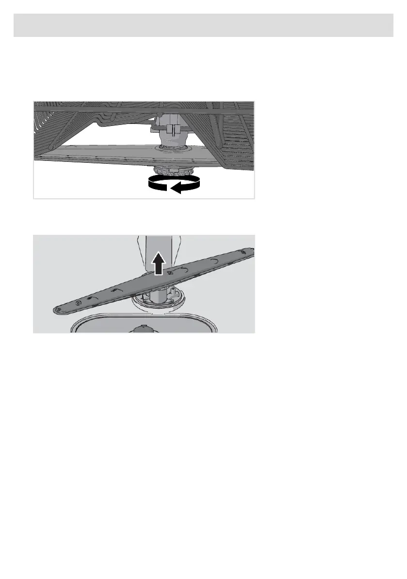 • Unscrew the spray arm bearings anticlockwise to remove the spray arm from the upper basket.