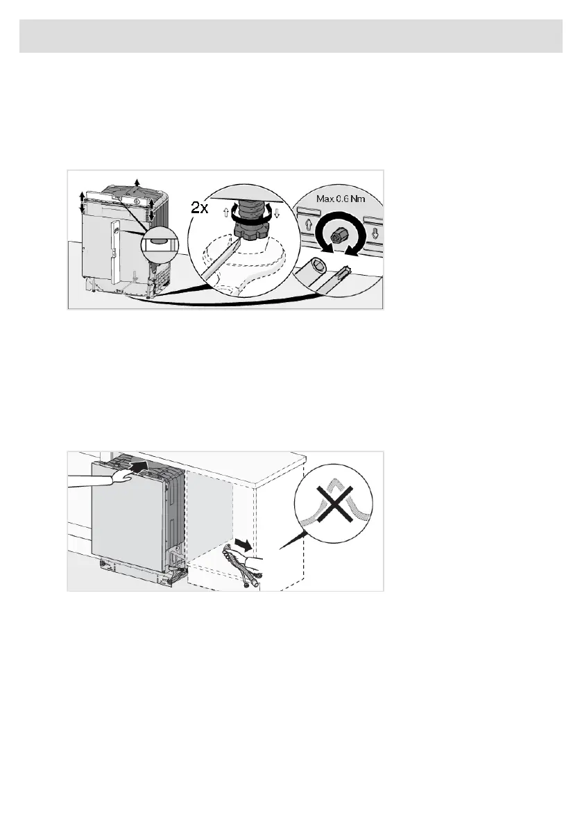 • Pull the inlet and drain hoses and the supply cord when sliding the dishwasher into place.