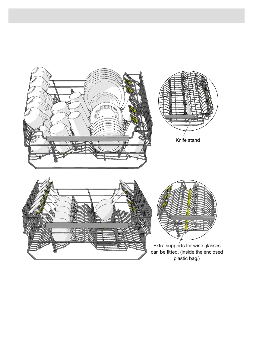 Place glasses, cups, bowls, side plates and saucers in the upper basket. All dirty surfaces should