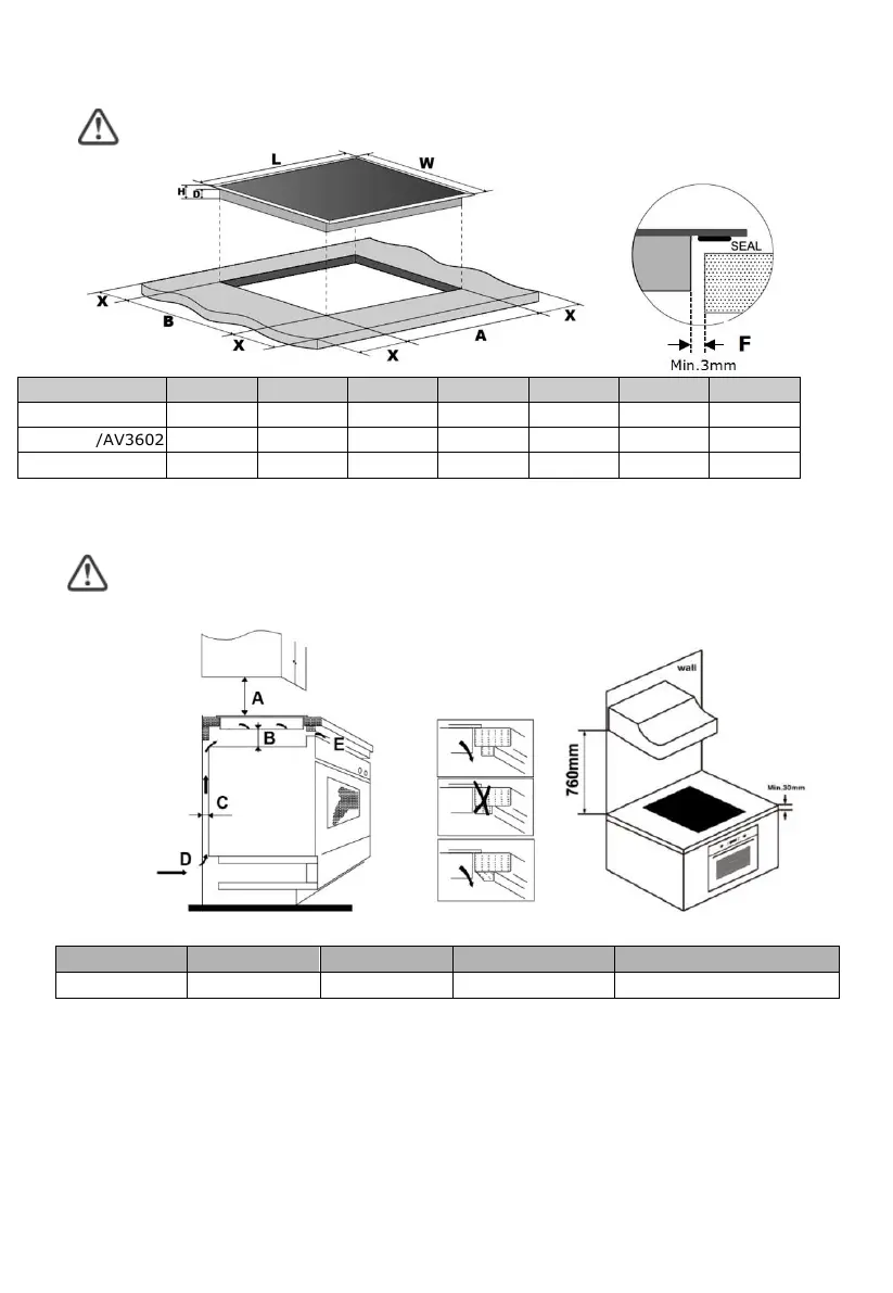 by screws, at a minimum distance of 50mm from the bottom of the hob. Follow the