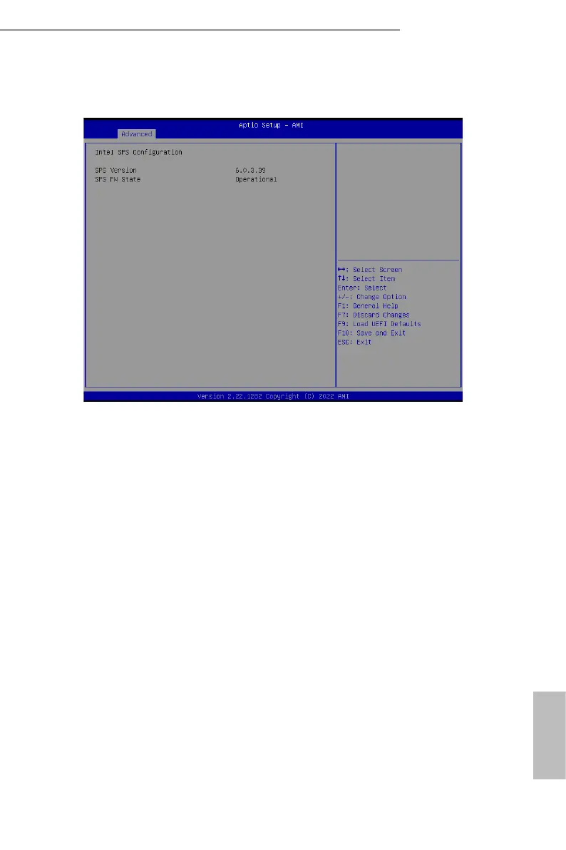 SPS screen displays the Intel SPS Configuration information, such as Operational