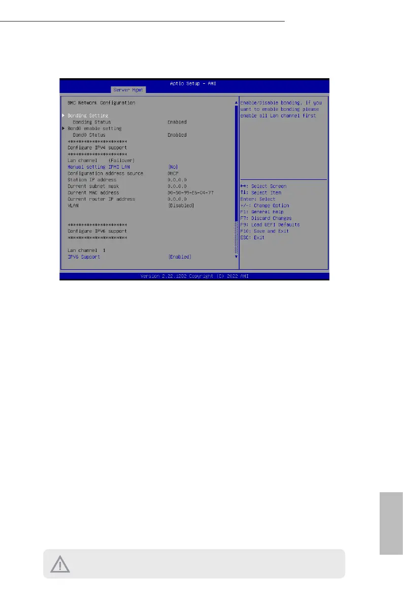 When [DHCP] or [Static] is selected, do NOT modify the BMC network settings on the