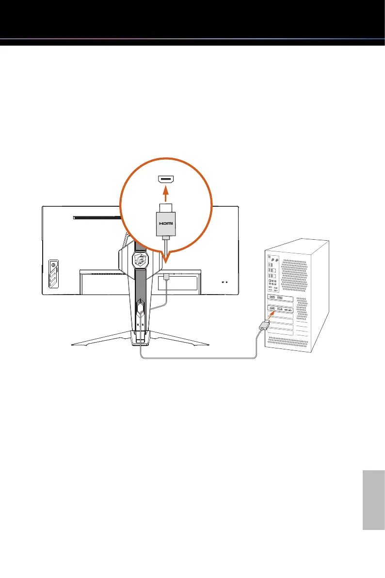 Connect one end of the HDMI cable to the HDMI connector on the rear side of the monitor.