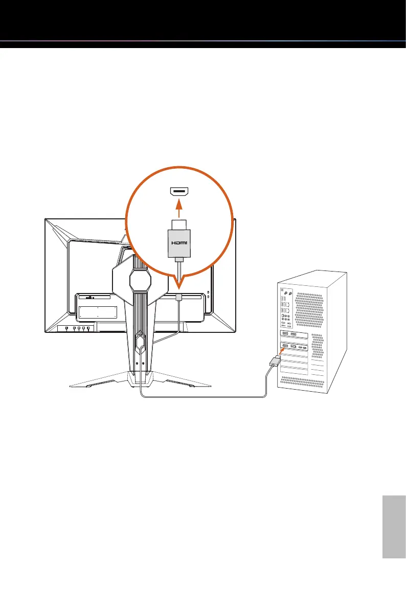 Connect one end of the HDMI cable to the HDMI connector on the rear side of the monitor.