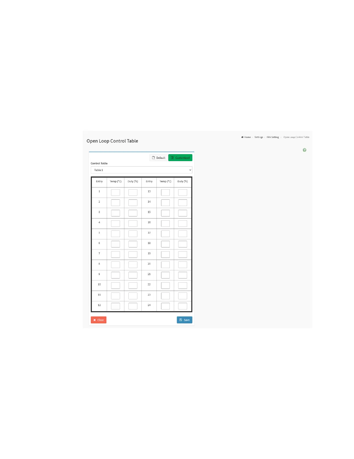 To view the Open Loop Control Table FAN page, click the Settings -> FAN