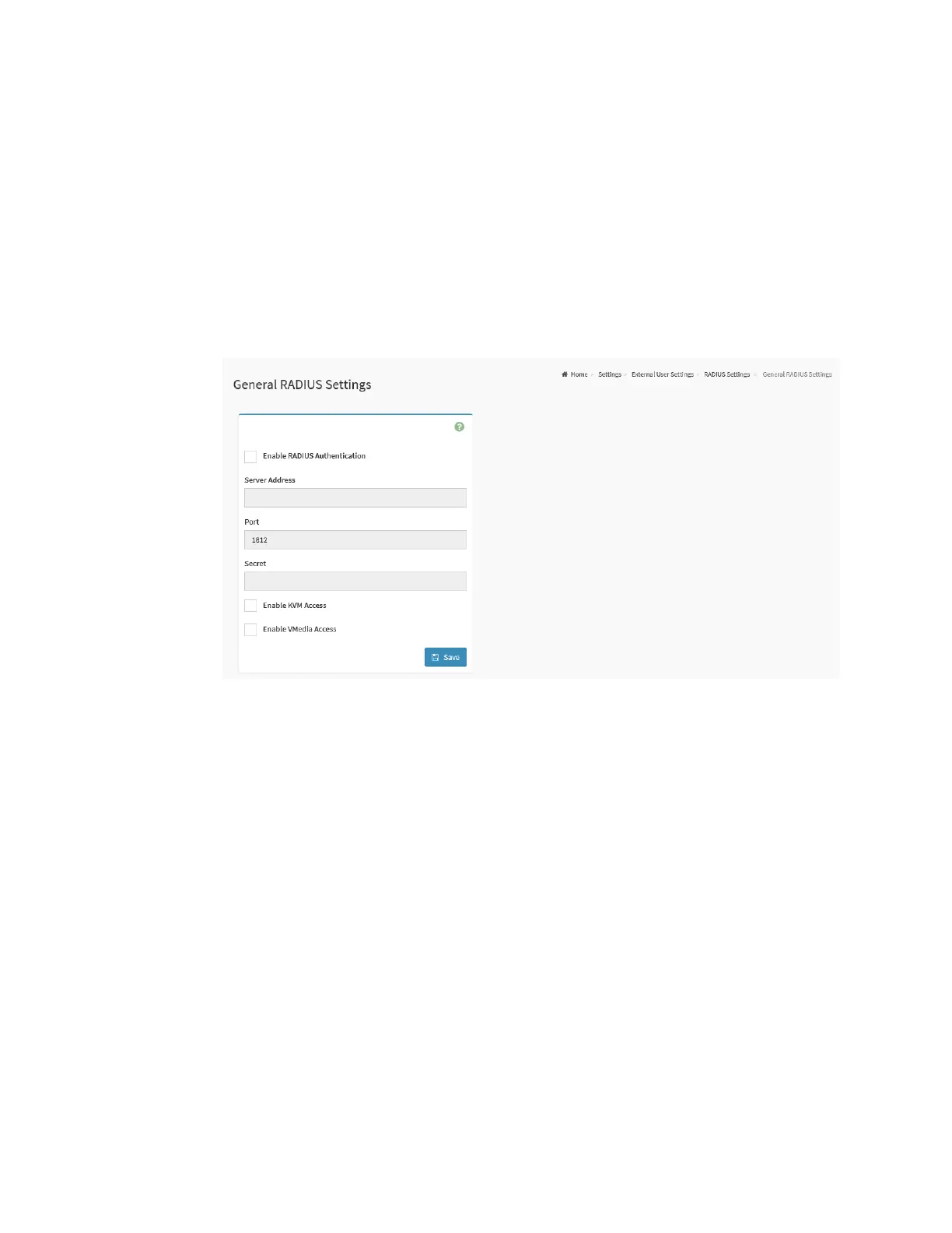 To view the General RADIUS Settings page, click the Settings -> External