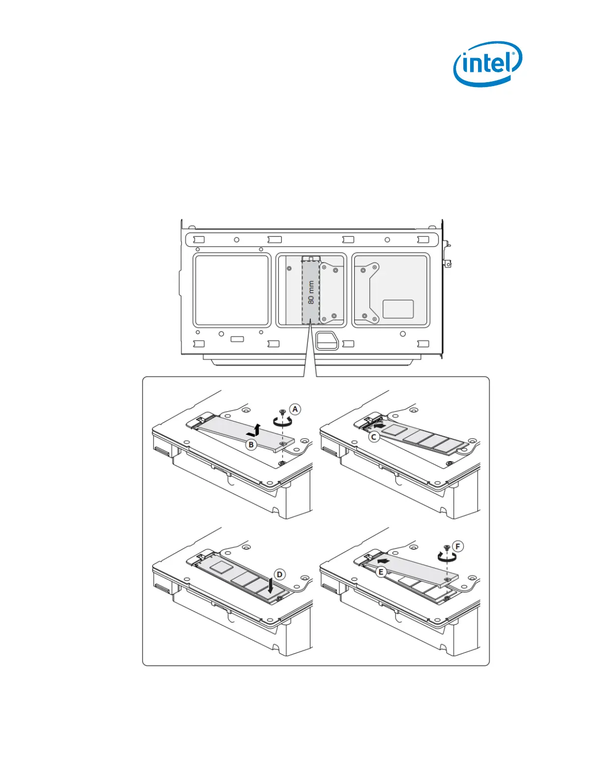 5. Install (E) and secure back the storage cover panel with the small screw (F)