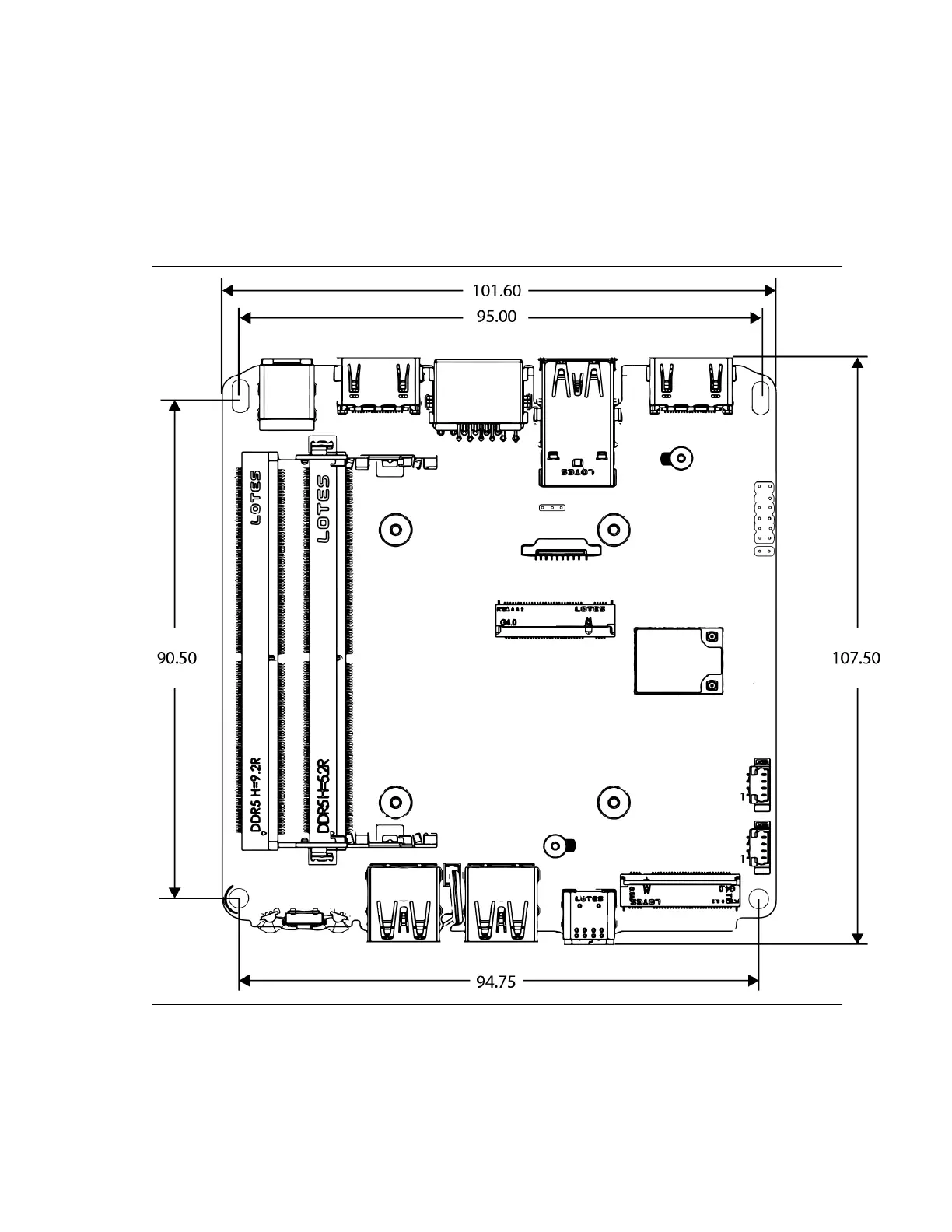 for the board. Dimensions are given in millimeters. The outer dimensions are 107.50 millimeters