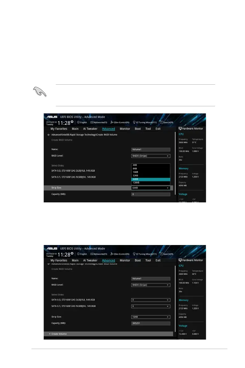 5. 在 Strip Size 的提示對話框中按下 <Enter> 按鍵來選擇 RAID 磁盤陣列(RAID