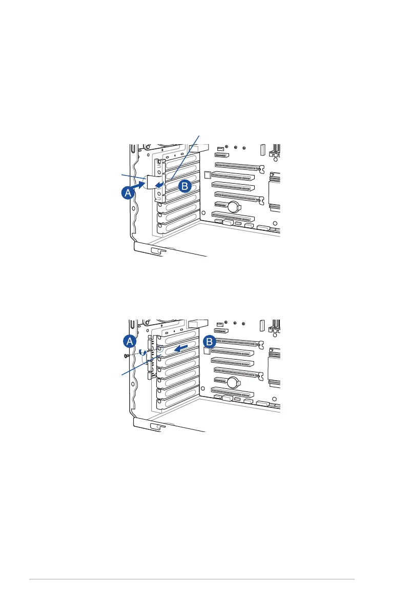 2. 按下 PCI-E 擋板固定扣(A),然後握住邊緣並朝(B)箭頭方向鬆開。