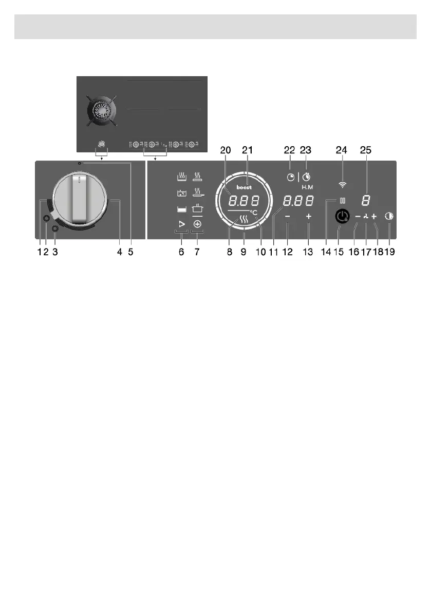 18. Afzuigkap (gekoppeld) inschakel en hogere afzuiging + (plus) aanraaktoets