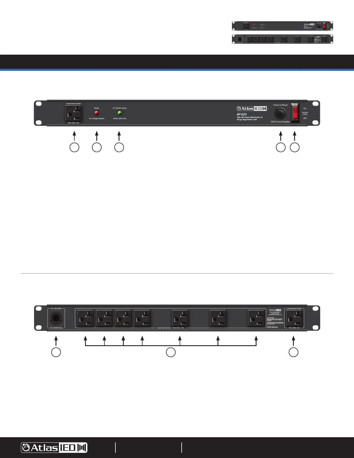 1. AC Mains Input - Connect the 12 gauge 9' (2.74m) power cord to a 20A 120VAC outlet to provide power to the AP-S20.