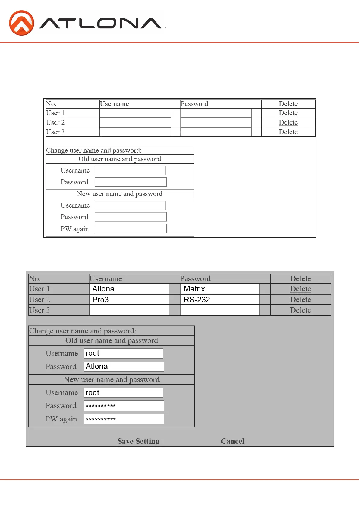 only be done by the admin. Admin user name is always “root” and default password is “Atlona”.