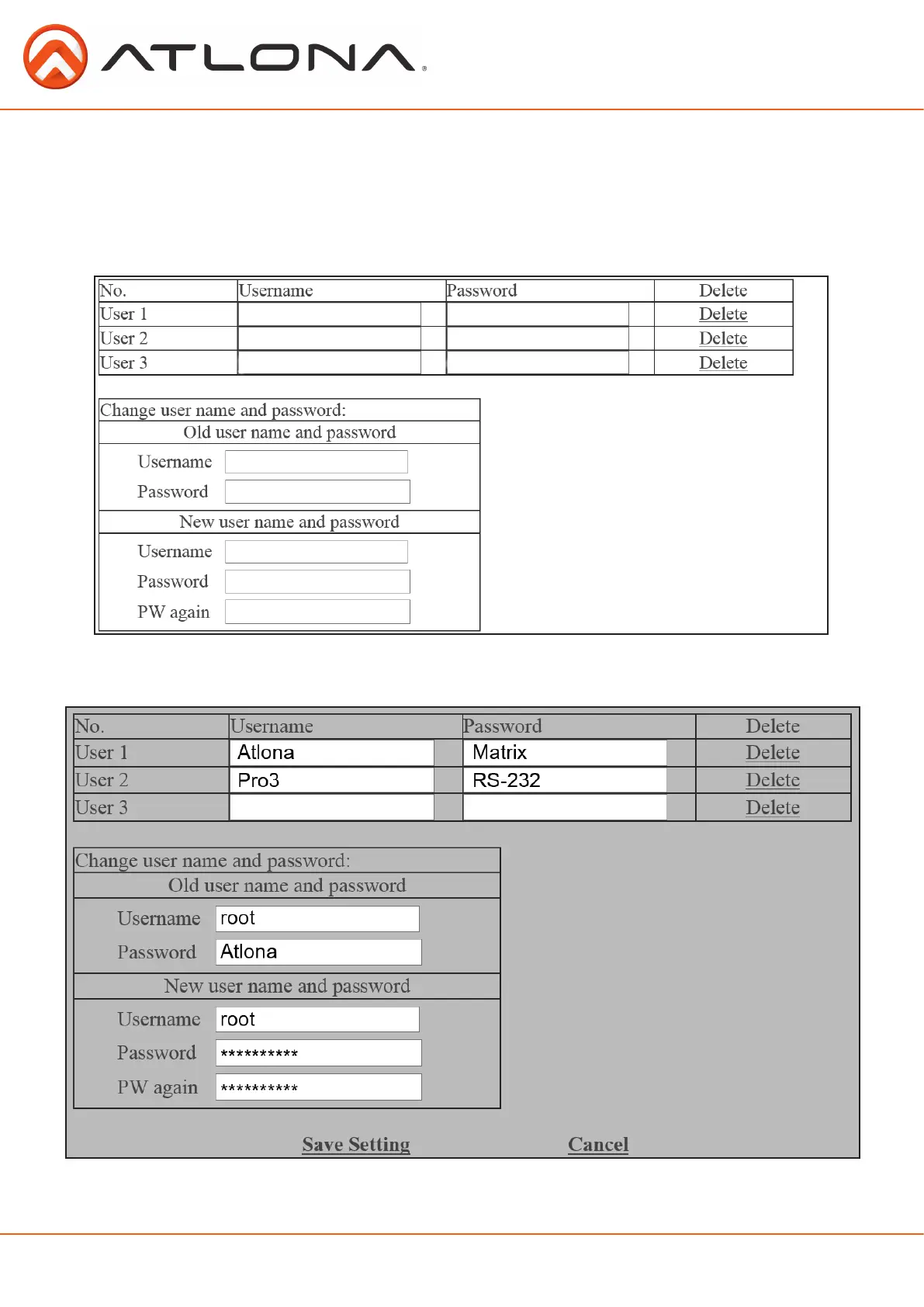 only be done by the admin. Admin user name is always “root” and default password is “Atlona”.