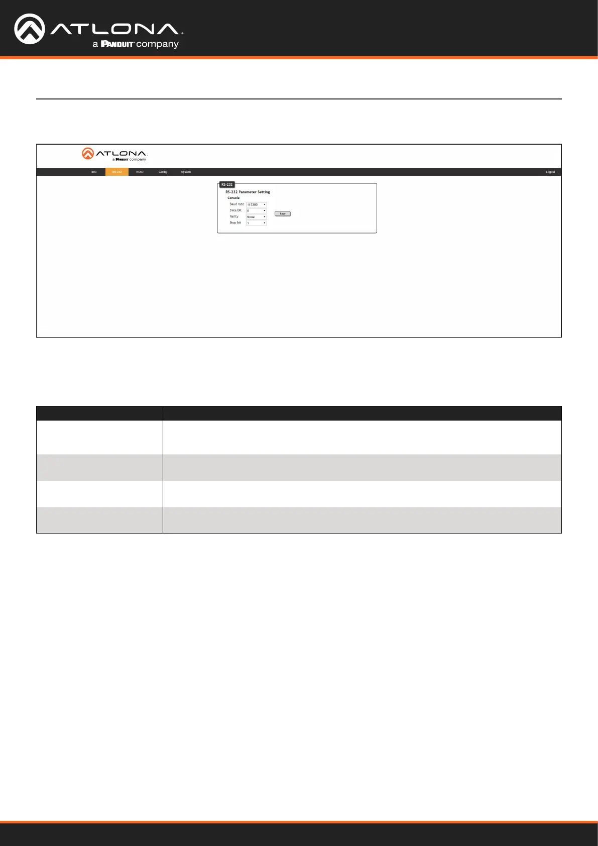 Baud rate Sets the baud rate. The following options are available: 2400, 9600, 19200, 38400,