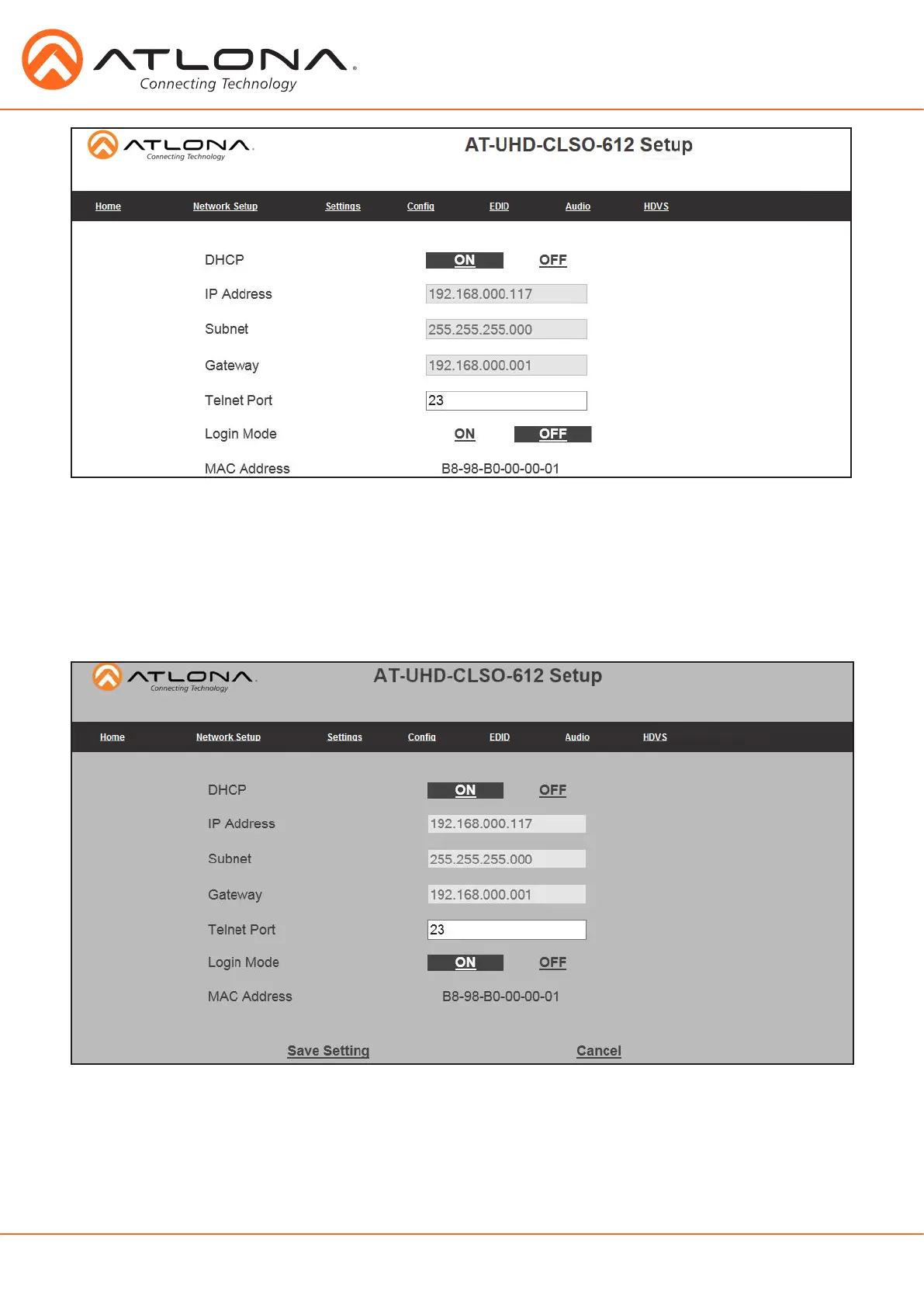 Note: When DHCP is on, the IP address cannot be configured. Turn DHCP off to enable IP configuration.