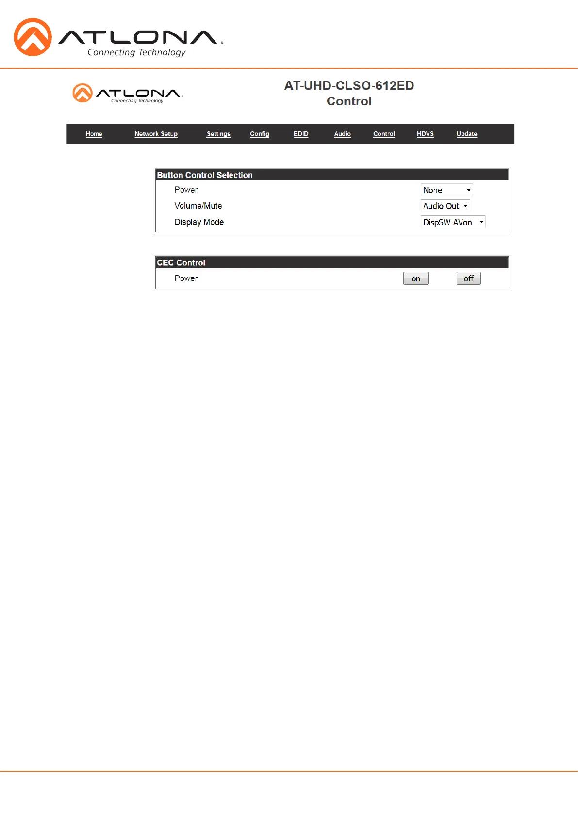 The Control Page includes settings which enable display controls by the switcher. It provides a