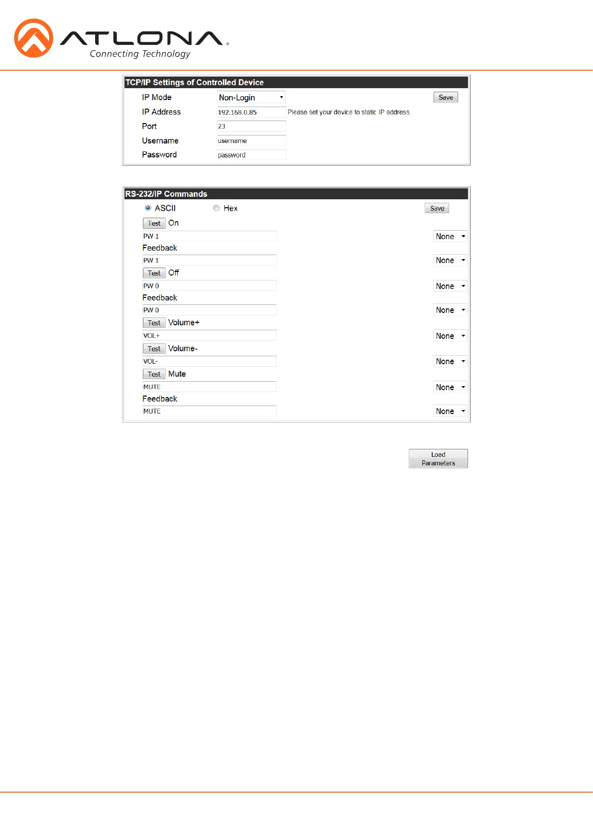 On/Off/Volume+/Volume-/Mute - Enter the specific commands and feedback that will be sent/