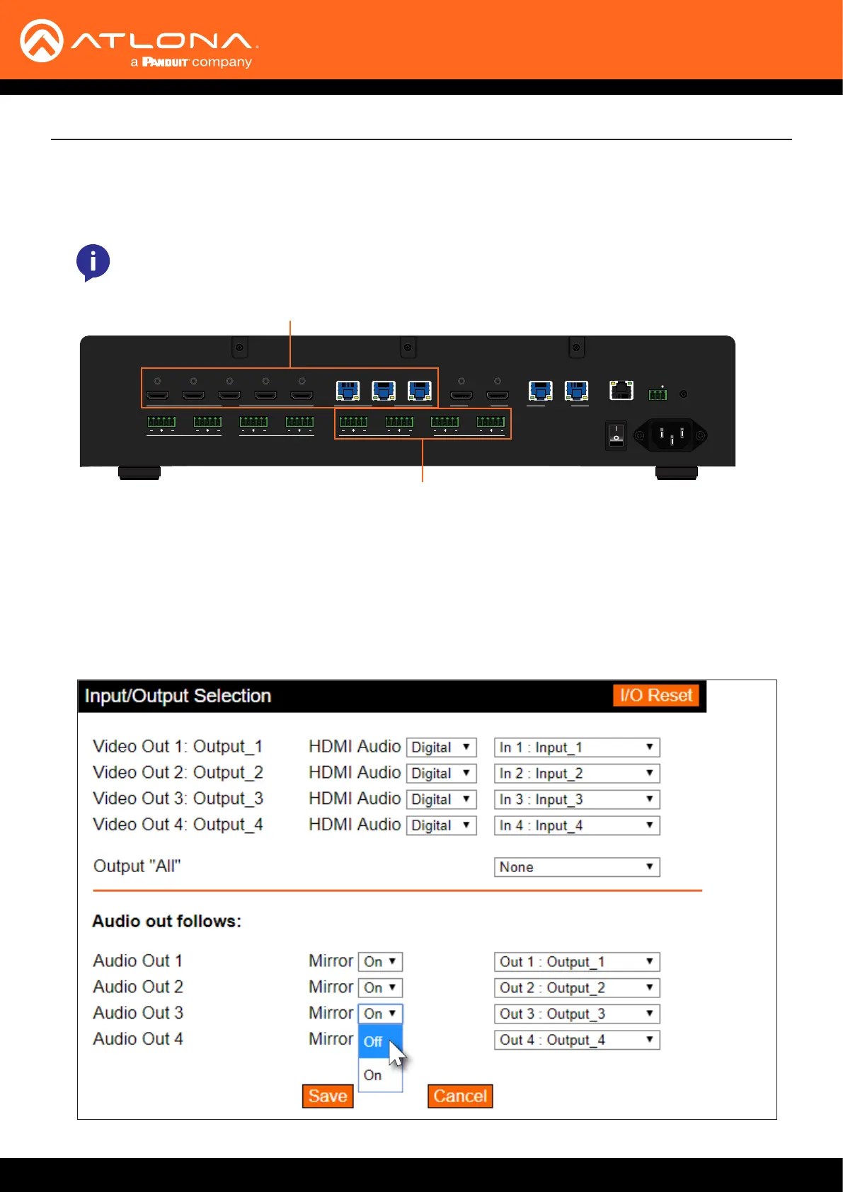 4. Click the Mirror drop-down list for Audio Out 3, and select O. Once mirroring is disabled, the drop-down list to