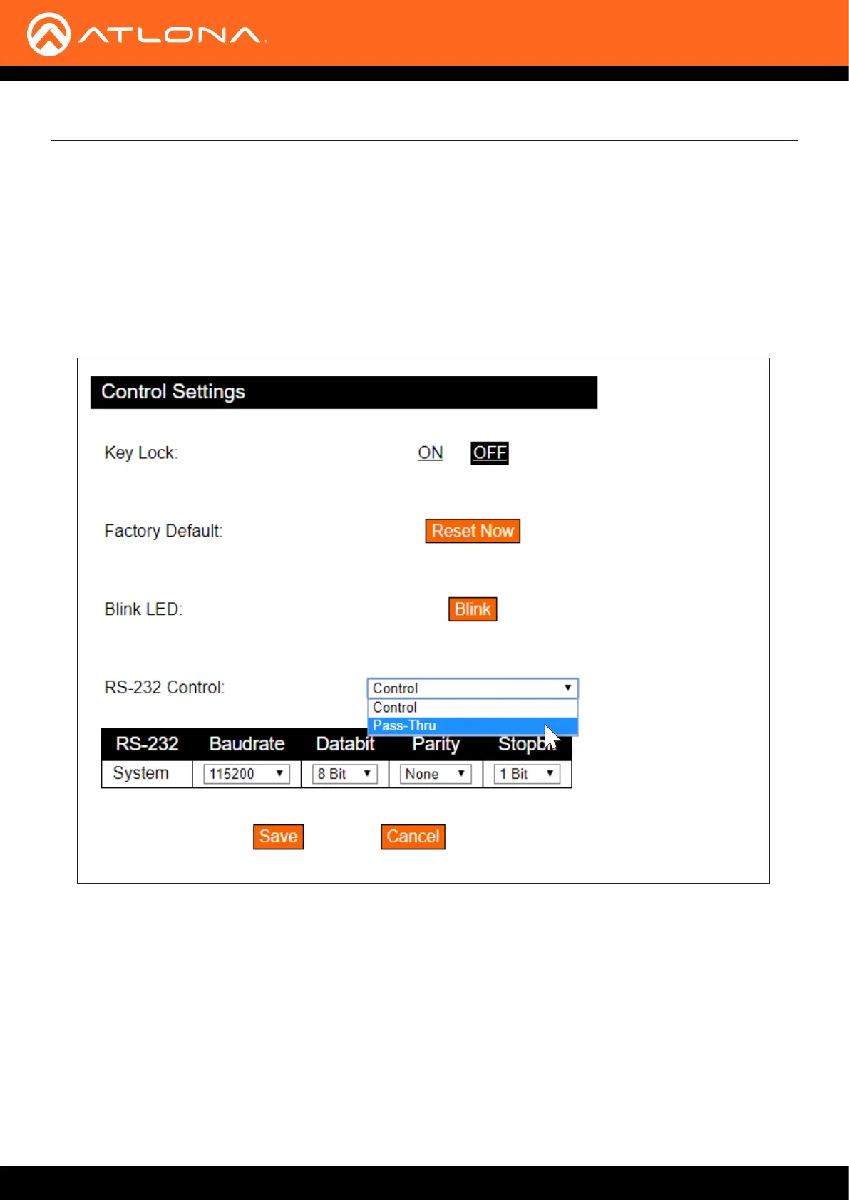 4. Click the RS-232 Control drop-down list and select Pass-Thru.
