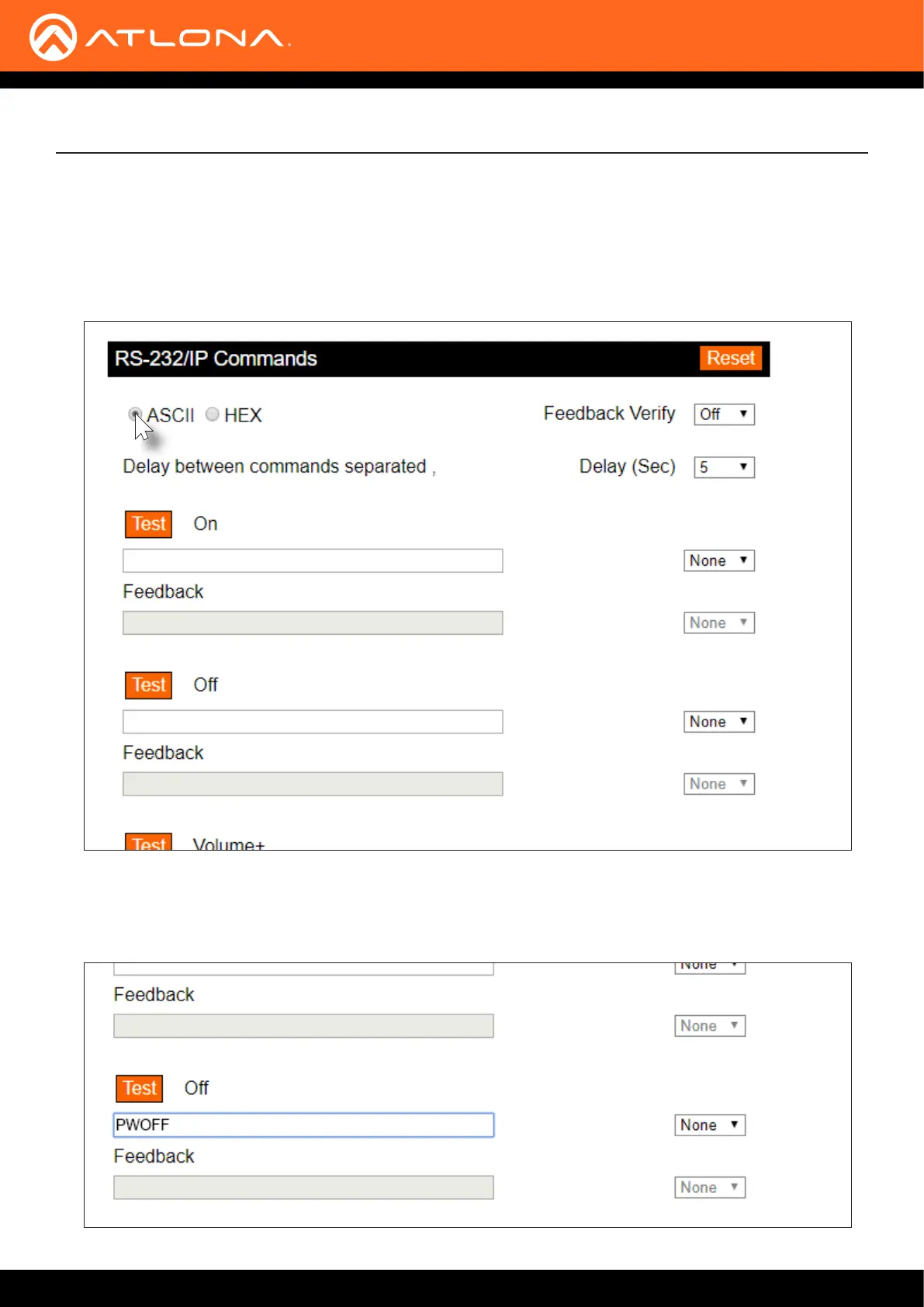 8. Click the ASCII or HEX radio button to select the desired command format. This option can be changed at any