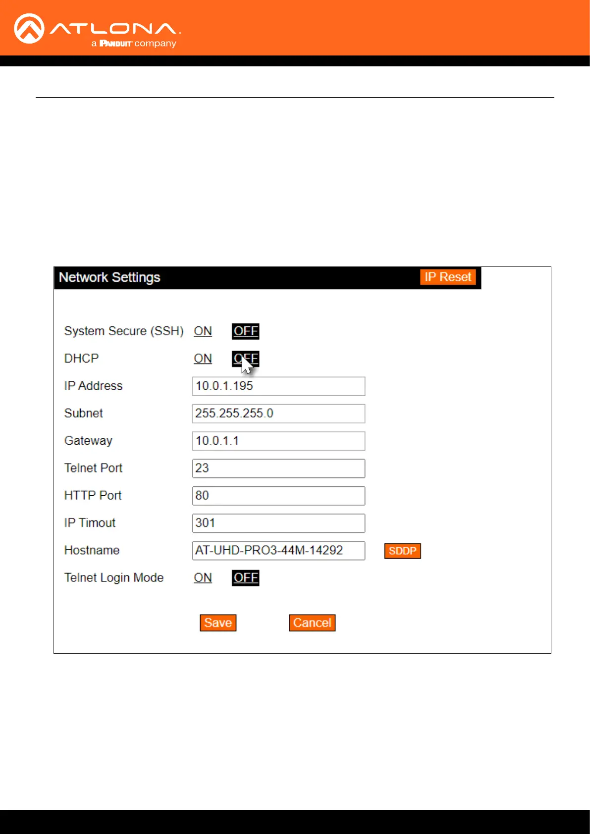 • Click ON, next to DHCP, to set the matrix to DHCP mode. If set to DHCP mode, the IP Address, Subnet,