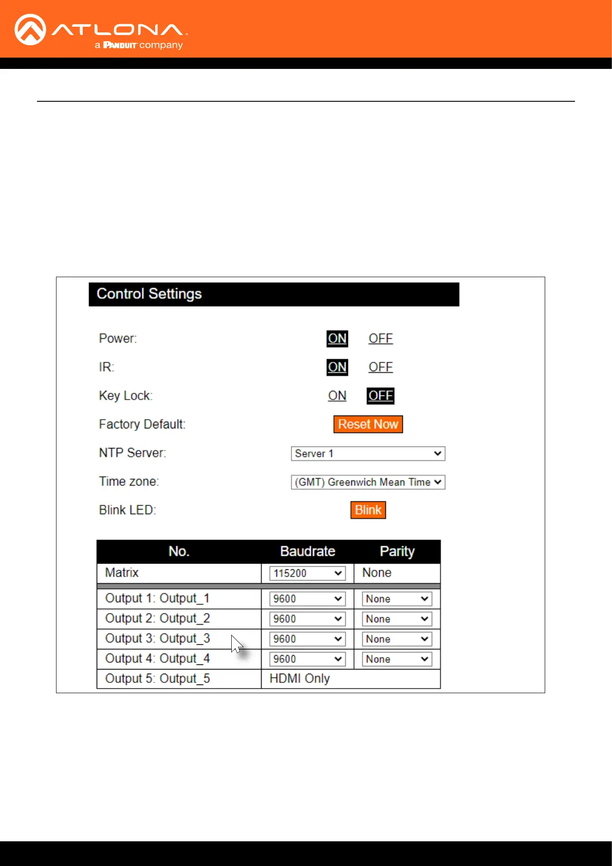 6. Select the proper baud rate, data bit, parity, and stop bit settings for the HDBaseT OUT port. These settings