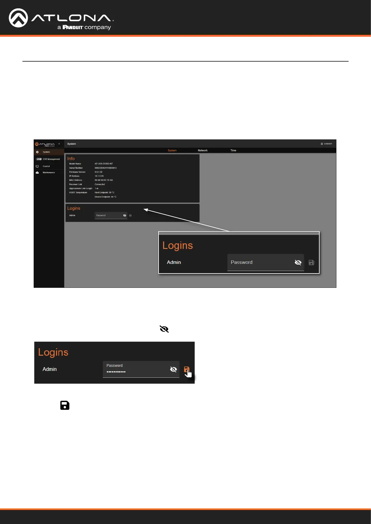 5. Enter the new password in the Admin eld. By default, the password will be masked. To toggle between