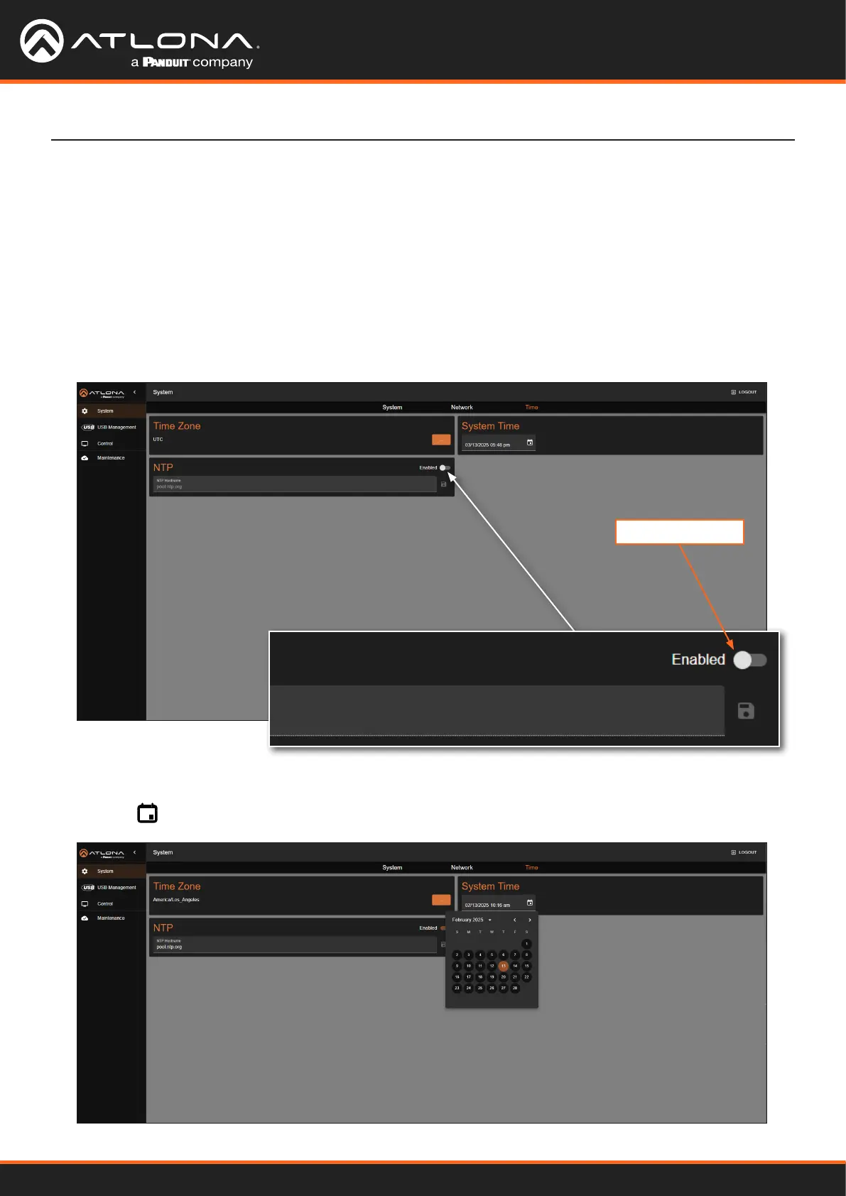 4. Locate the NTP window group and click the Enabled toggle button to disable NTP. When NTP is disabled, the