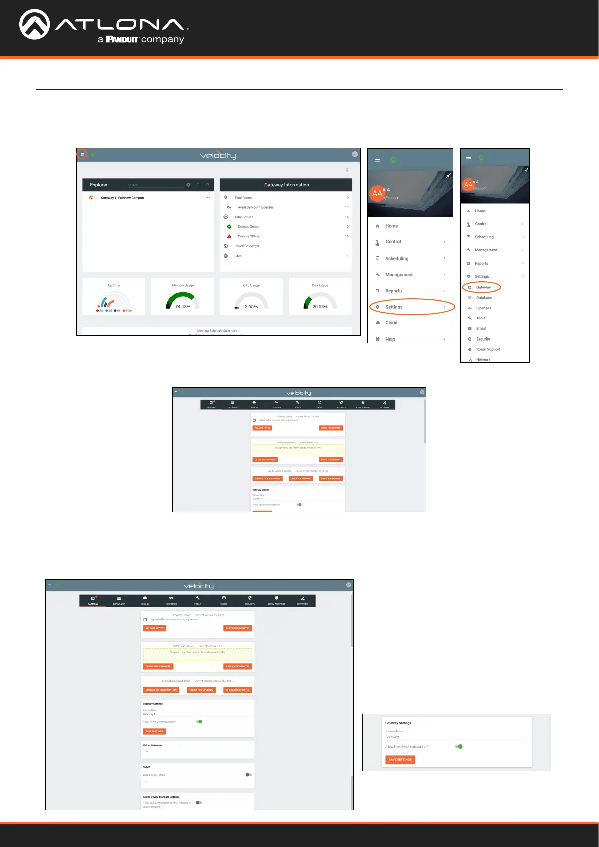 Gateway is the default page opened when Settings is selected. It provides basic information for Velocity, such as: