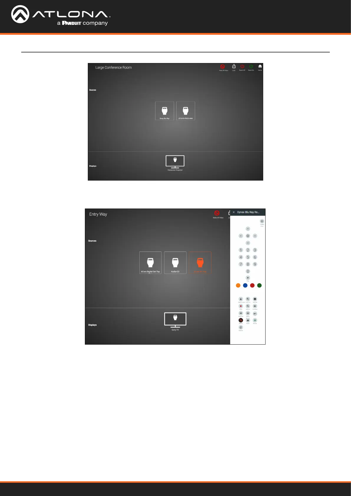 On this screen, devices can be controlled by selecting (web browser) or touching (touch pads) the icons.