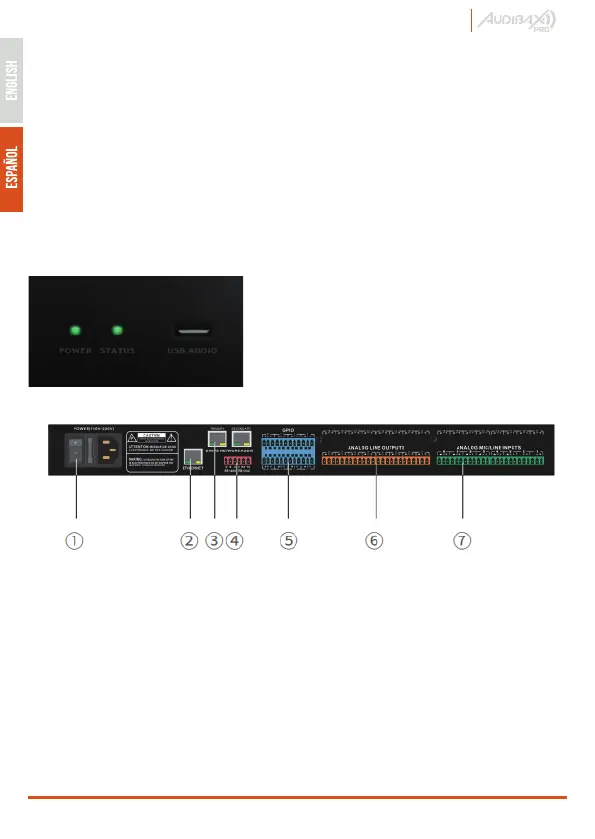 ③ Interfaz de red Dante: (solo en M88DSP Dante ) puerto de red dedicado al protocolo