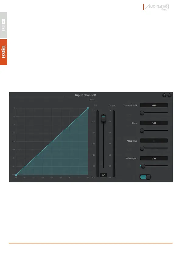 - Umbral: Cuando el nivel de la señal es superior al umbral, el compresor/limitador