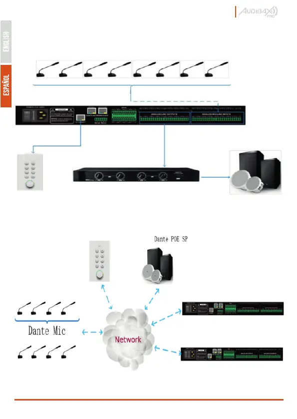 únicamente una red ethernet con alimentación PoE a través del protocolo Dante.