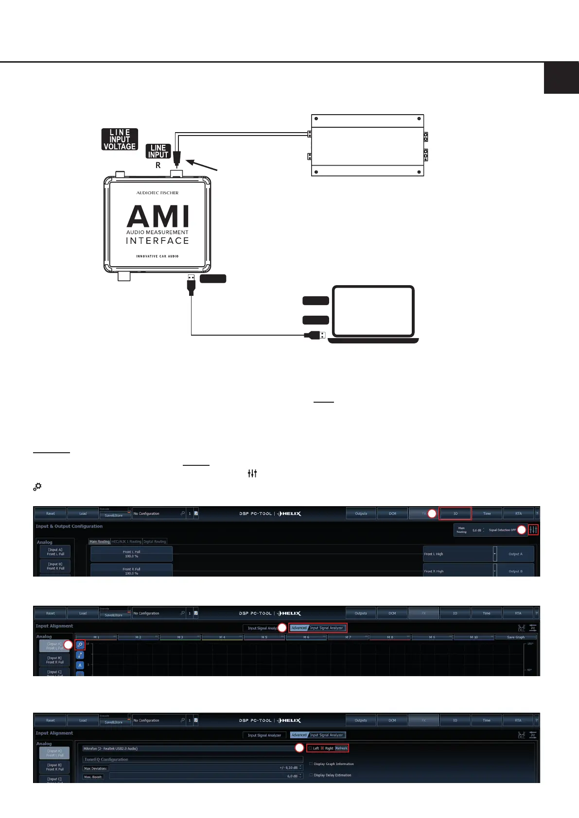 Der Line Input (R) Voltage-Schalter (Seite 5, Punkt 6) muss auf 40 V gestellt werden. AMI wird per USB-C Kabel mit