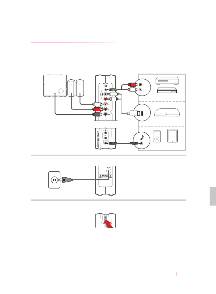 Podłącz satelity, subwoofer, konsolę i inne źródła dźwięku do panelu 1.