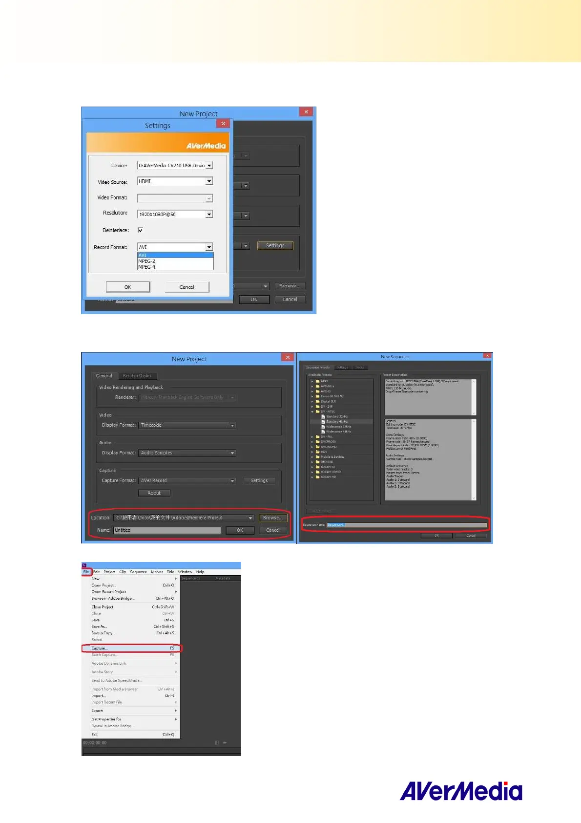 6. 点击 Settings, 选择你的 AVerMedia 设备,照着 Video Source, Resolution Record Format