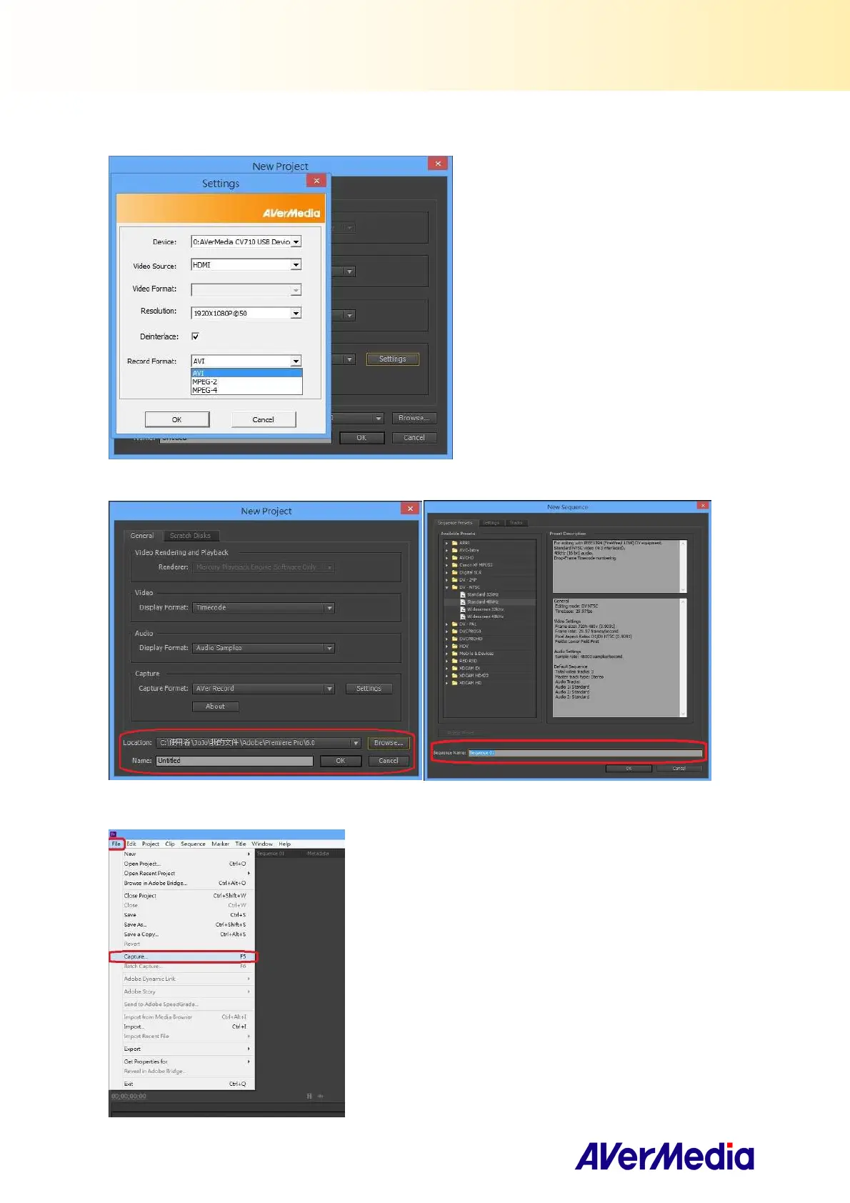 6. Click Settings, then choose your AVerMedia device, Video Source, Resolution and Record