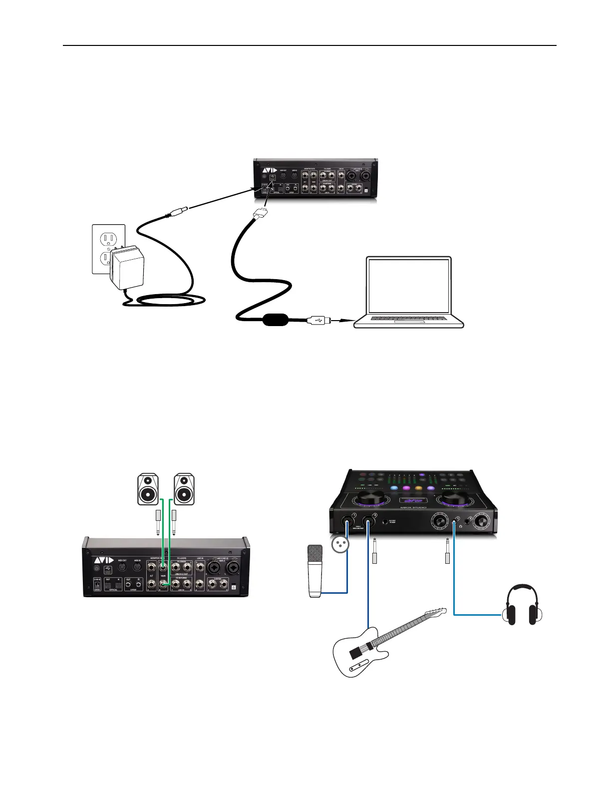 The following diagrams show example audio connections. Consider making only minimal input and output connections now while you