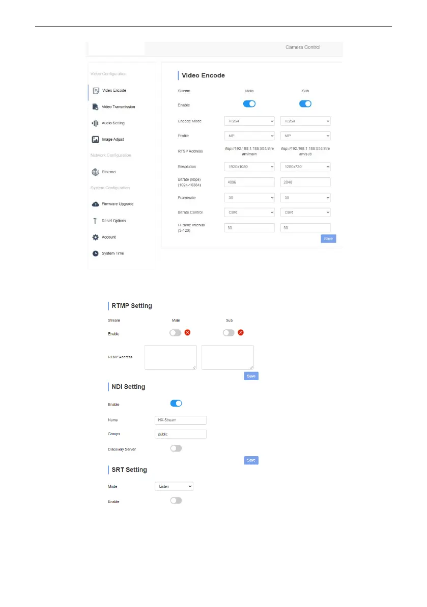 Video Transmission: RTMP, NDI and SRT settings are available, as shown below: