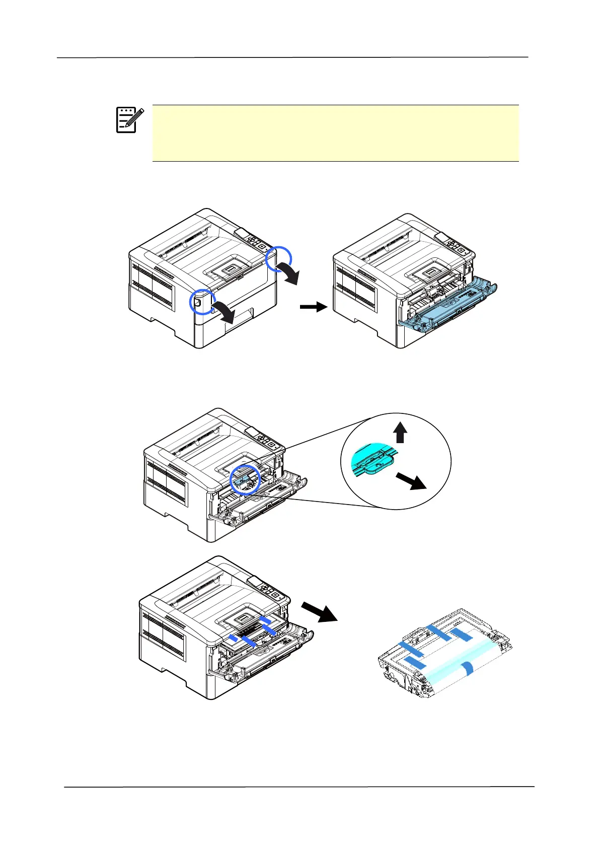 2. 握住感光鼓的把手,將感光鼓沿著軌道,慢慢移出。