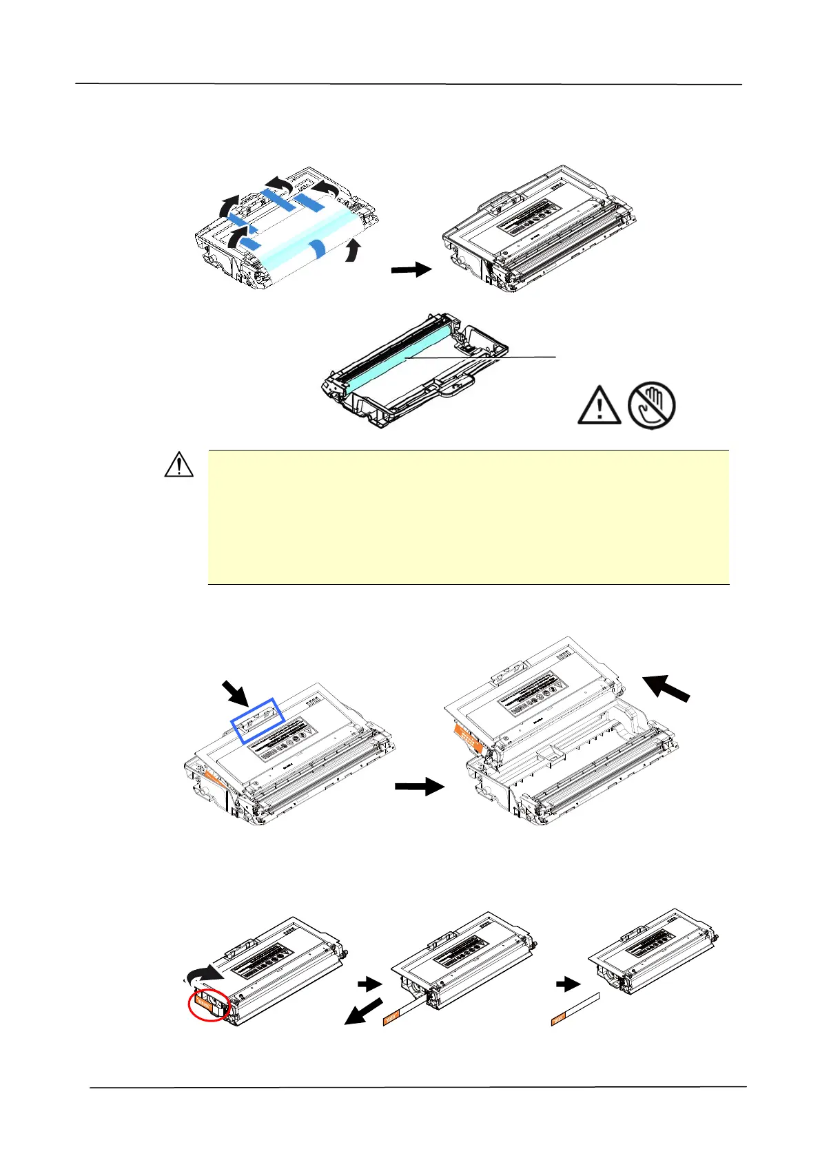 3. 移除所有膠帶,包含感光鼓中間的保護膜與兩邊的膠帶。在移除過程中,請勿觸摸