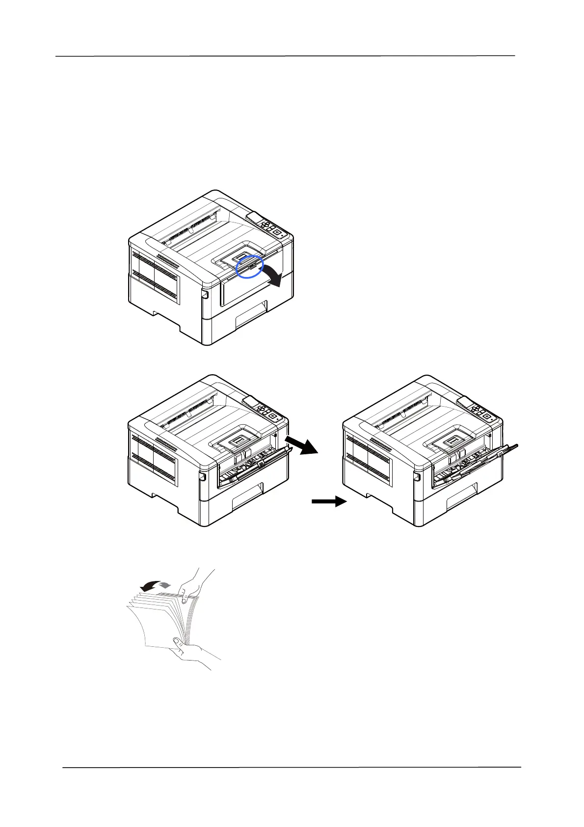 1. 握住手動紙匣的把手再往下拉開,手動紙匣即可開啟。