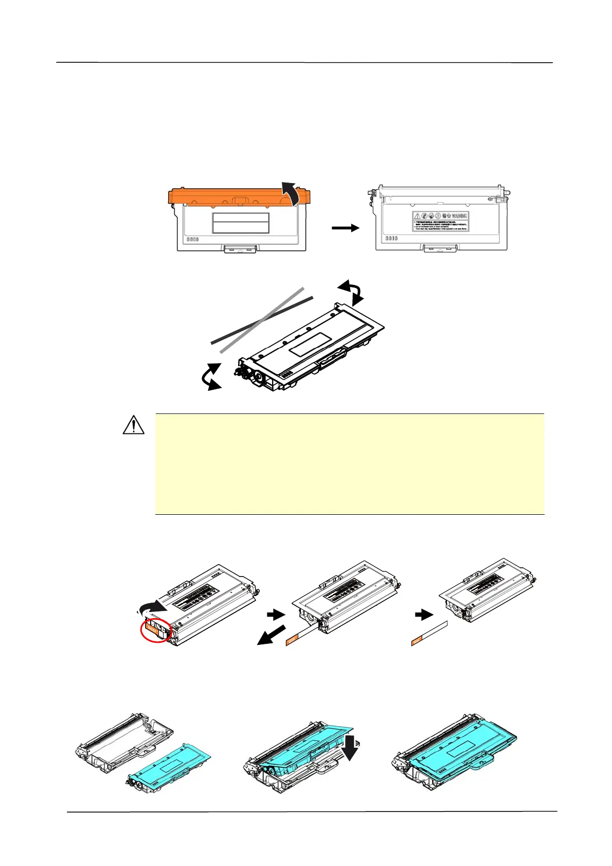 將碳粉匣的保護封條抽出,直到完全抽離為止。