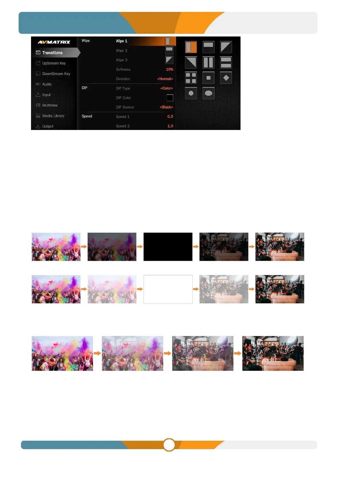 Press the DIP key to execute the DIP transition effect.The DIP effect supports the following two modes: