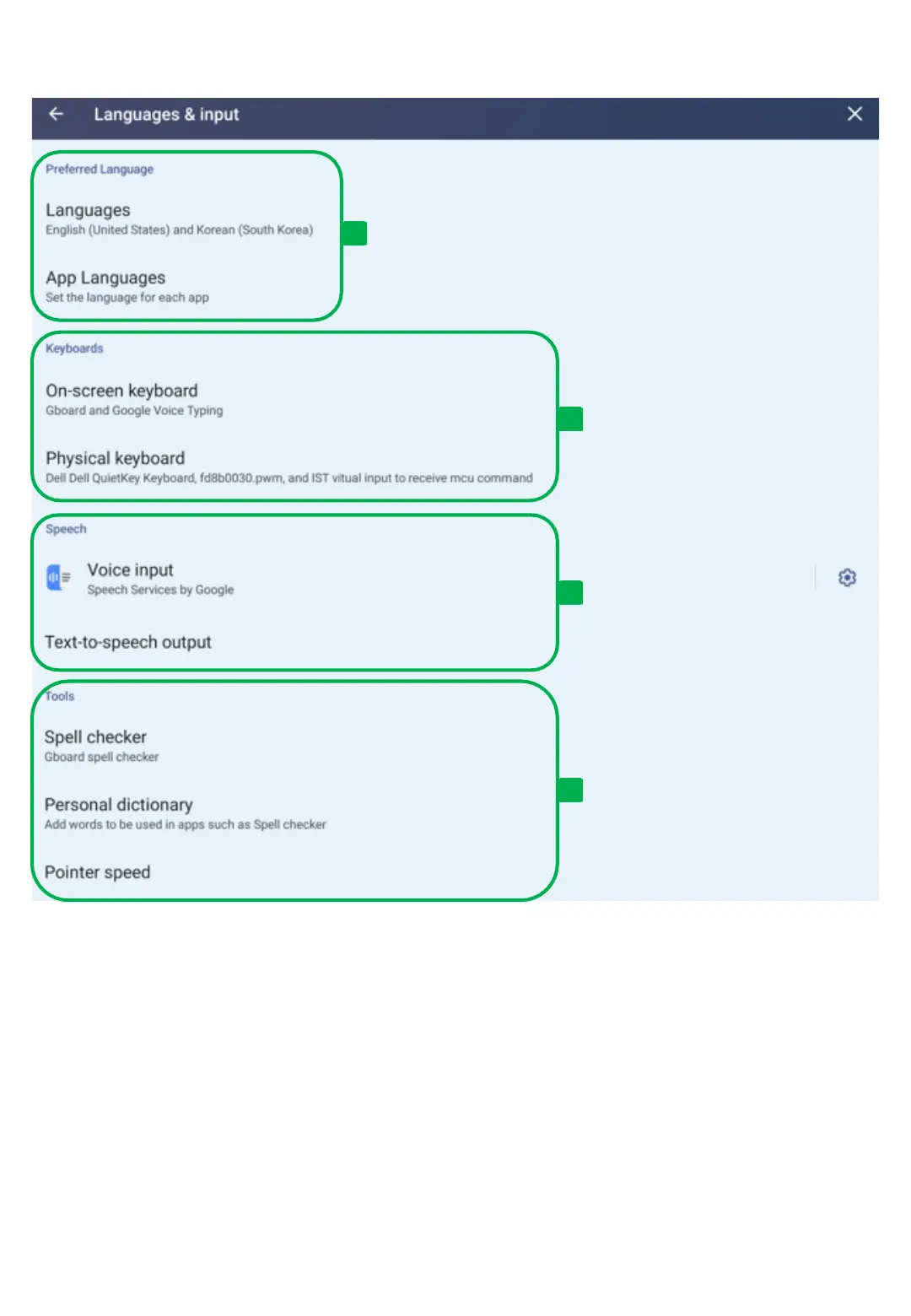 Physical keyboard: Manage settings such as language, layout, and more for the physical keyboard.