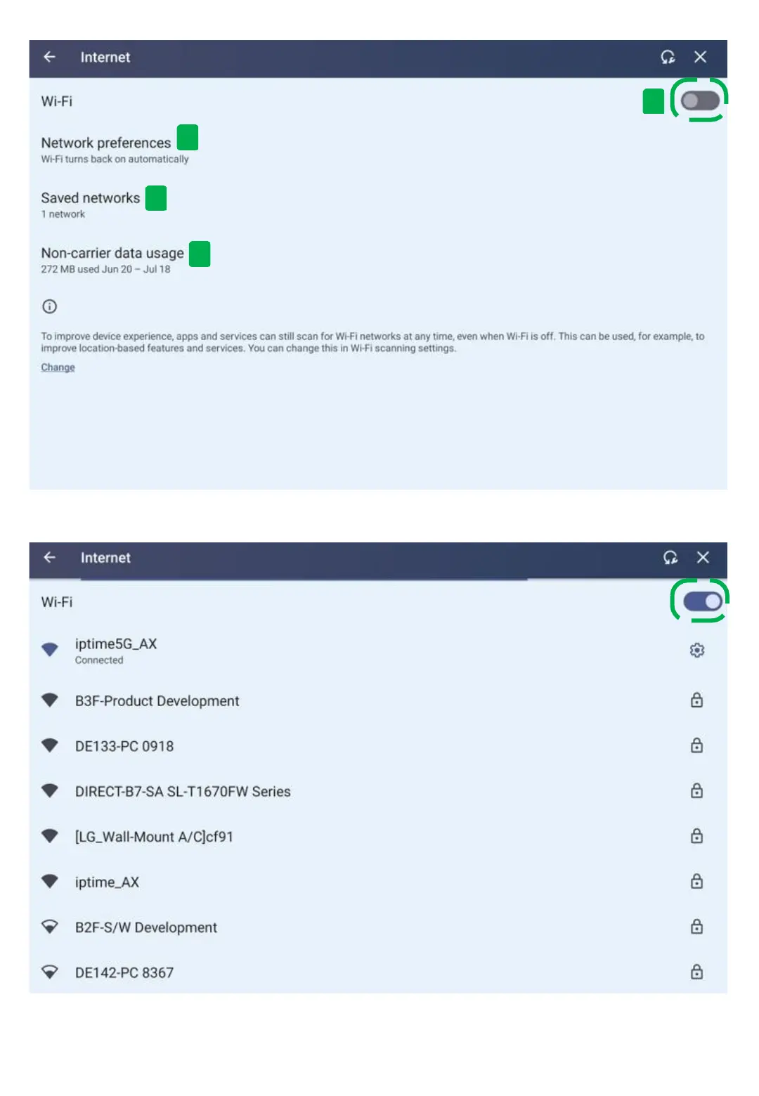 - Press the Wi-Fi ON/OFF button to detect nearby Wi-Fi signals. (2.4GHz ~ 5GHz)