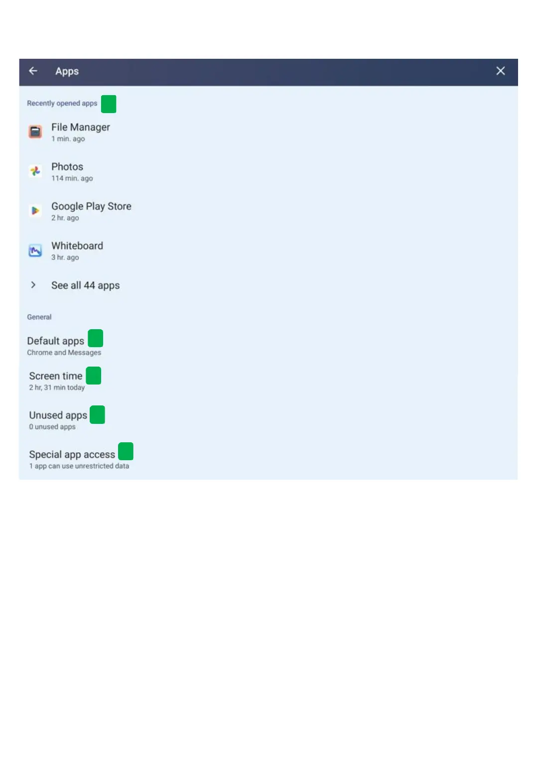 Shows recently open App items and allows Users to view all App items installed on the display.